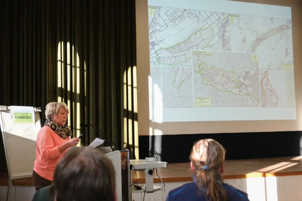 Nach der Begrüßung durch den 1. Beigeordneten Frank Bretsch und MORO-Projektleiterin Theresa Schiller stellte Dr. Nicole Spundflasch, Leiterin des Landwirtschafts-, Umwelt- und Veterinäramts, die prekäre Wassersituation im Landkreis dar: Die stark eingeschränkte Grundwasserneubildung gefährde die Wasservorräte der Region. Eine wesentliche Ursache sei die schnelle Ableitung von Niederschlagswasser aus der Landschaft, verschärft durch den Klimawandel. Gegenmaßnahmen seien dringend nötig. Der Landwirtschaft komme hier eine wichtige Rolle zu. Bereits kleine Maßnahmen können einen wichtigen Beitrag leisten. Zur Unterstützung kündigte die Kreisverwaltung die Einführung eines kurzen Antragsverfahrens für einfache Maßnahmen und den Aufbau eines sogenannten Flächenpools an, aus dem die bauliche Umsetzung von Kleinstprojekte künftig finanziert werden soll. Dr. Spundflasch bat die Anwesenden, gemeinsam zu überlegen, wo sie Möglichkeiten für unkritische Wasserrückhaltemaßnahmen auf ihren Flächen sehen und diese mit ihr zu besprechen.