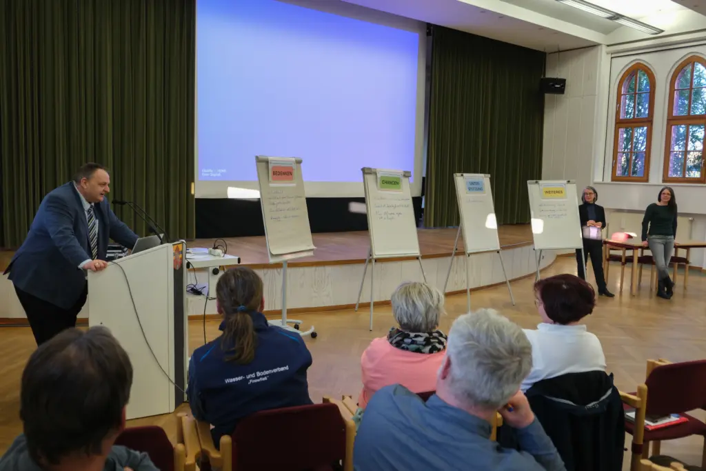 Dem folgte die Präsentation des ersten Entwurfs des Handlungskonzepts: Dies soll über Herausforderungen und Handlungsbedarfe zum Thema Wasser in der Landschaft informieren, Verständnis für besondere Handlungsbedarfe schaffen und als Grundlage für weitere Planungen und Umsetzungen von Maßnahmen dienen. Dazu wird es ausgewählte Schwerpunkträume mit besonderem Handlungsbedarf darstellen sowie einzelne Maßnahmen konkret beschreiben, um eine effektive Umsetzung interessierter Akteure zu unterstützen. Das Handlungskonzept richtet sich an Vertreterinnen und Vertreter der Kommunen, der Regionalplanung, an die Wasser- und Bodenverbände, an Landeigentümer/-innen, Landnutzer/-innen sowie weitere relevante Akteure.